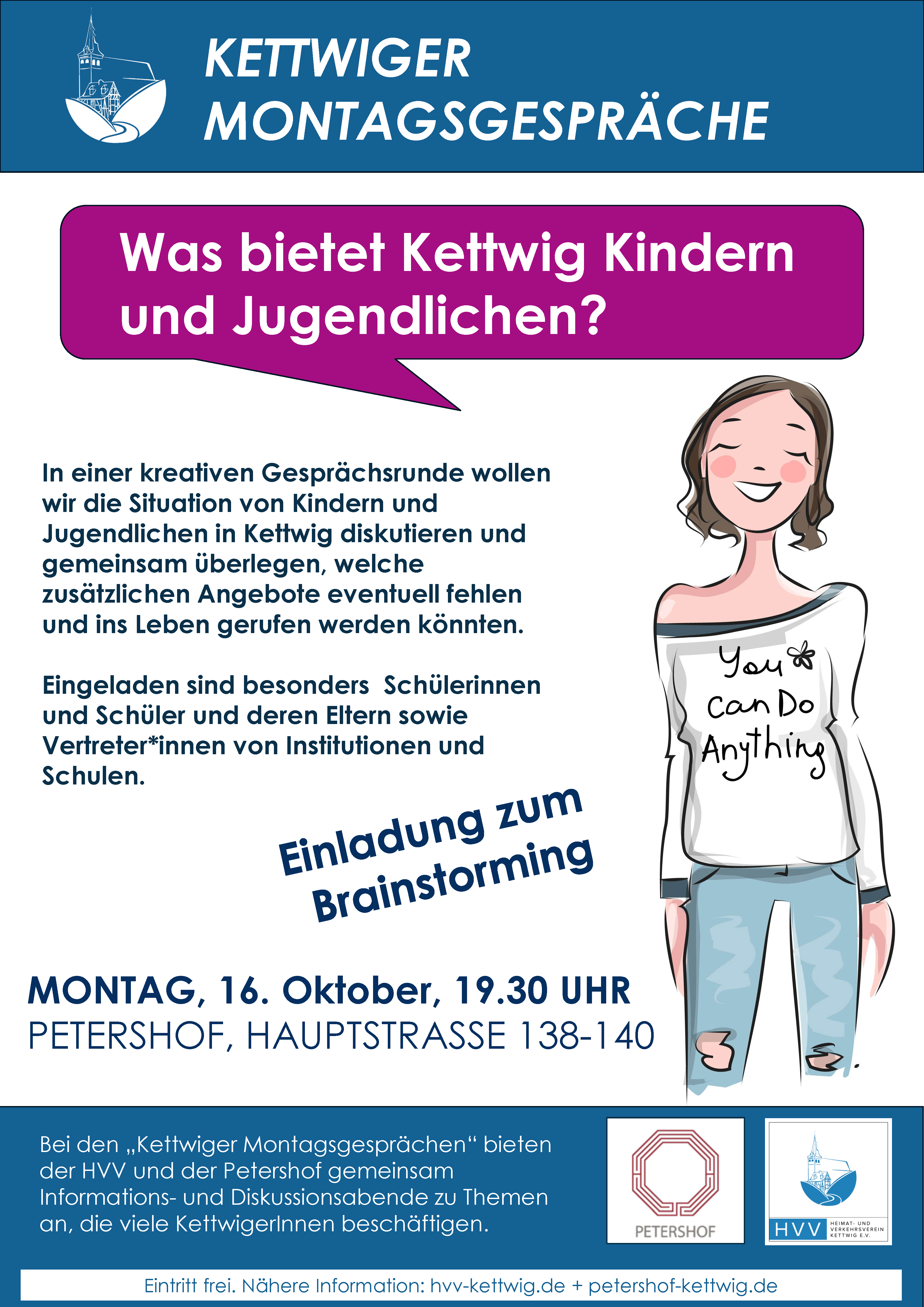 Die Kettwiger Montgasgespräche von HVV und Petershof laden für Montag, 16. Oktober um 19.30 Uhr zu einem experimentellen Format ein: In einer kreativen Gesprächsrunde wollen wir die Situation von Kindern und Jugendlichen in Kettwig diskutieren und gemeinsam überlegen, welche zusätzlichen Angebote eventuell fehlen und ins Leben gerufen werden könnten.