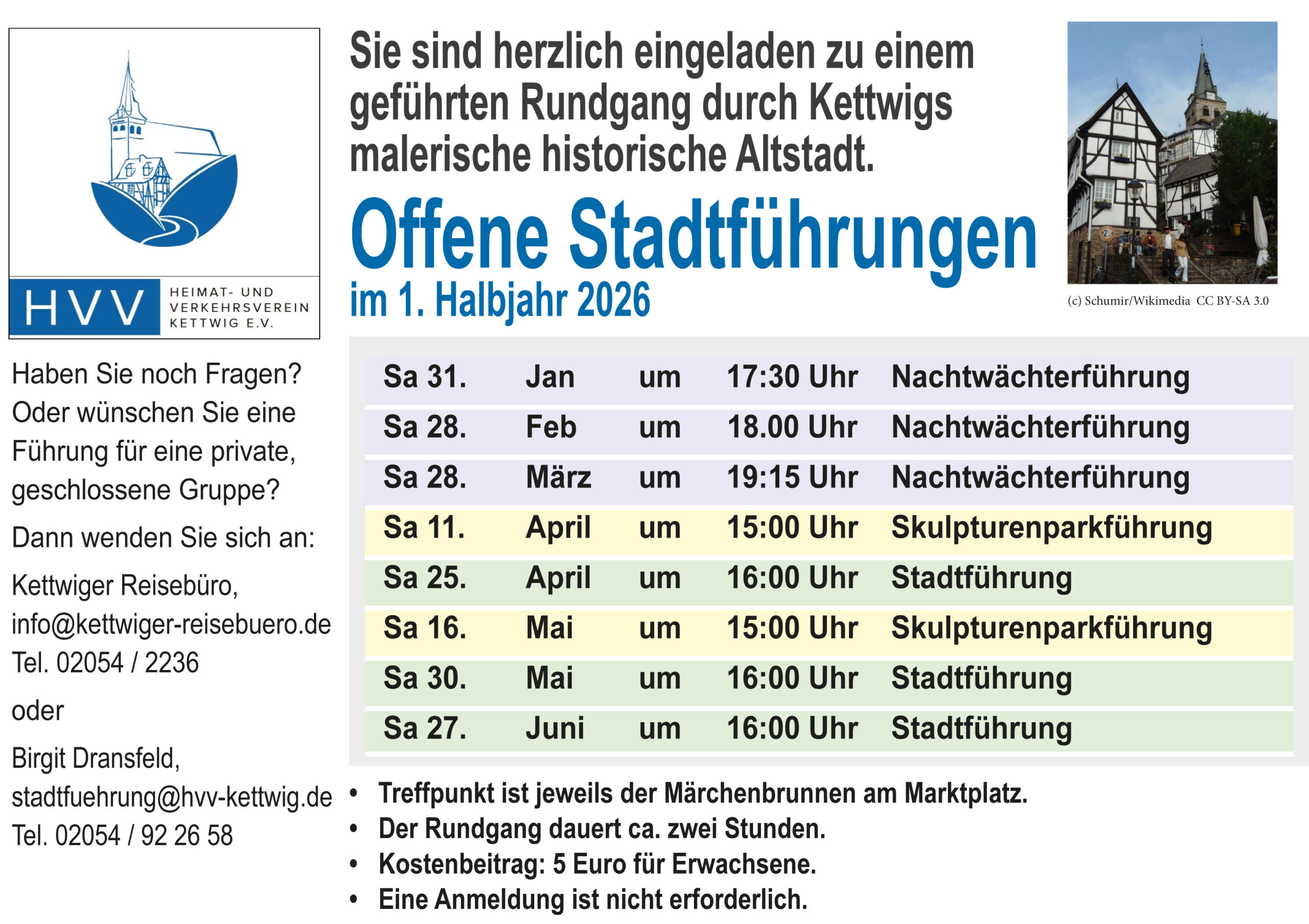 Größere Gruppen oder Freundeskreise buchen bitte eine eigene, separate Führung. Hierbei können Sie selbst den Termin wählen. Anfragen unter stadtfuehrung@hvv-kettwig.de oder 02054 922658