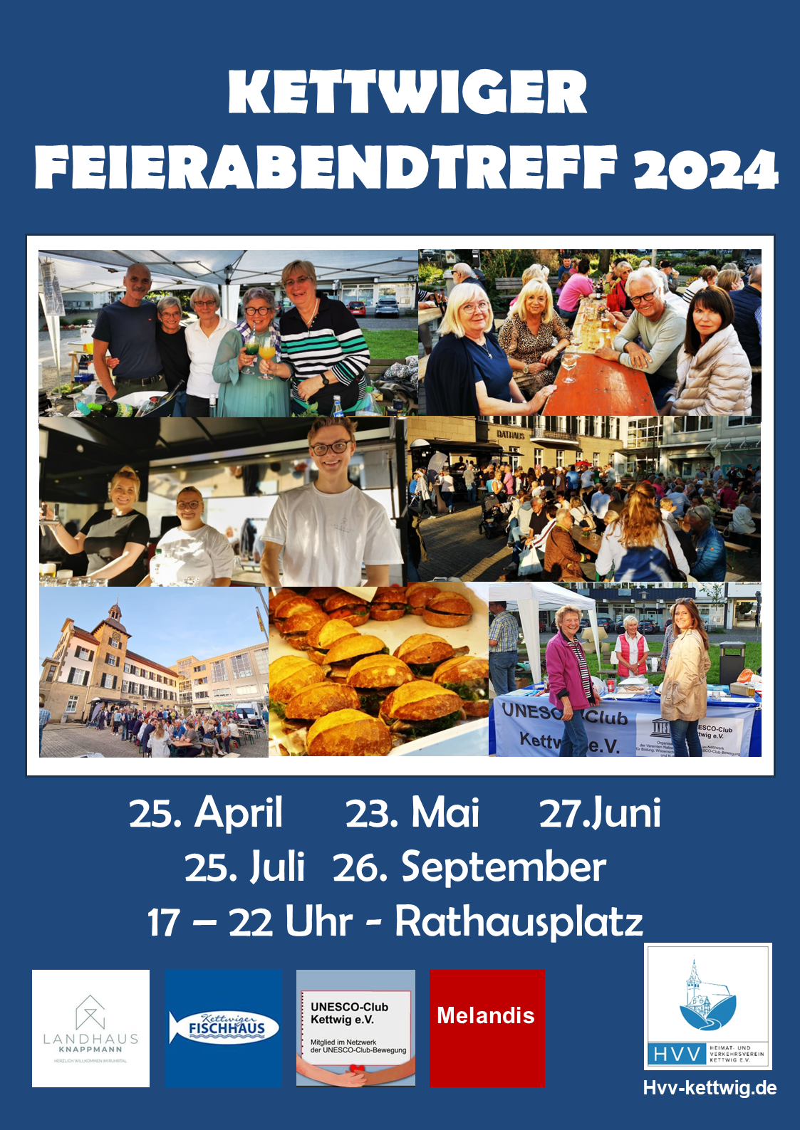 Am 25. April startet der HVV in die Saison der beliebten Feierabend-Treffs auf dem Rathausplatz. Mit dabei sind die Partner Landhaus Knappmann, Awo und UNESCO-Club Kettwig sowie abwechselnd das Kettwiger Fischhaus und Melandis to go.