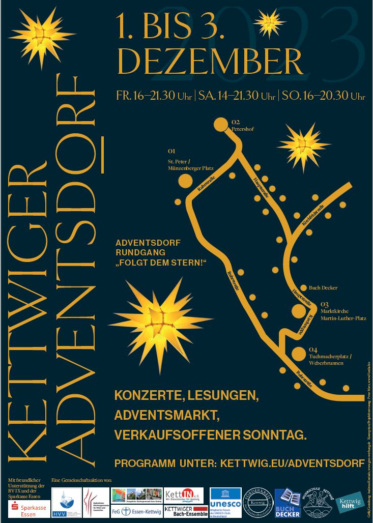 Am ersten Adventswochenende lädt eine außergewöhnliche Arbeitsgemeinsschaft aus Vereinen und Kirchengemeinden ins „Kettwiger Adventsdorf“. Folgen Sie dem Stern und bummeln Sie durch die Kettwiger Altstadt. Auch am Sonntag haben viele Altstadtgeschäfte für Sie geöffnet.