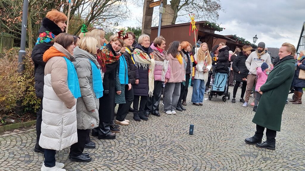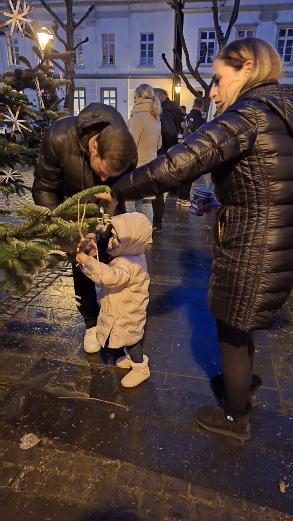 Sterne markierten den Rundweg durch die Altstadt und Mini-Sterne konnten an den Verkaufsständen gesammelt und auf Karten aufgeklebt werden, sie berechtigten am Sonntagnachmittag zur Teilnahme an der Verlosung. Die Veranstalter hatten ein vielfältiges Programm zusammengestellt: in allen Kirchen fanden Konzerte statt, z. B. mit dem Gospel- und Posaunenchor. Die Orchester der Schmachtenbergschule und des Theodor-Heuss-Gymnasiums traten auf, die Musikschule und das Kettwiger Bach-Ensemble. Für Kinder war der Winterspielplatz der freien evangelischen Gemeinde geöffnet. Ein Weihnachtsmusical, von Kindern gespielt, ein Krippenspiel, eine Märchenlesung und das Kamishabi-Erzähltheater stimmten die Kinder auf die Adventszeit ein. Am ukrainischen Stand trat ein Chor des Landes auf und sang Weihnachtslieder, unter anderem auch unser schönes Lied „Stille Nacht“, sogar auf Deutsch. Amüsante Weihnachtsgeschichten waren bei Lesungen zu hören. – Natürlich war auch für das leibliche Wohl bestens gesorgt, denn an allen drei Plätzen gab es gastronomische Spezialitäten und warme Getränke. Der HVV hatte in diesem Jahr nicht nur Glühwein, sondern auch Reibekuchen im Repertoire. Die Verkaufsstände boten Kreatives für die Weihnachtszeit an, natürlich hatten auch die Mitglieder von UNESCO und der KfD viele schöne Dinge für die Bazare gezaubert. Viele Besucher nutzen das Angebot und bummelten durch die Stadt, denn der Sonntag war verkaufsoffen. die Sonne schien, es war eine Freude, durch das Adventsdorf zu schlendern. Inzwischen ist auch die Aktion „Wünschebaum“ beendet, die Senioren freuten sich über die schönen bunten Geschenke und erfüllten Wünsche.