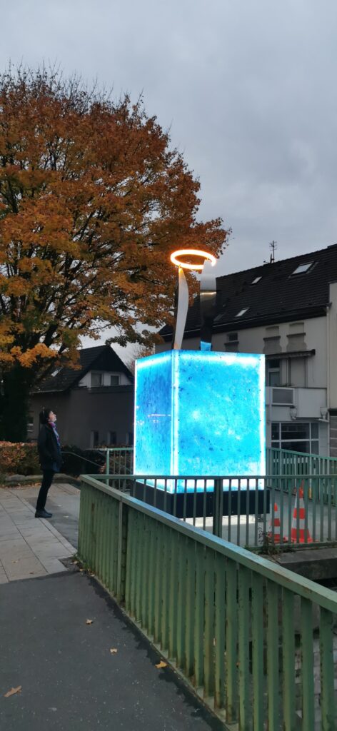 Durch ihre Lage an der viel frequentierten Ruhrbrücke, die Nähe zum Wasser und die abendliche Beleuchtung entwickelt „Fisch vermählt“ eine starke Präsenz im Stadtraum und wird zu einer neuen Landmarke Kettwigs.