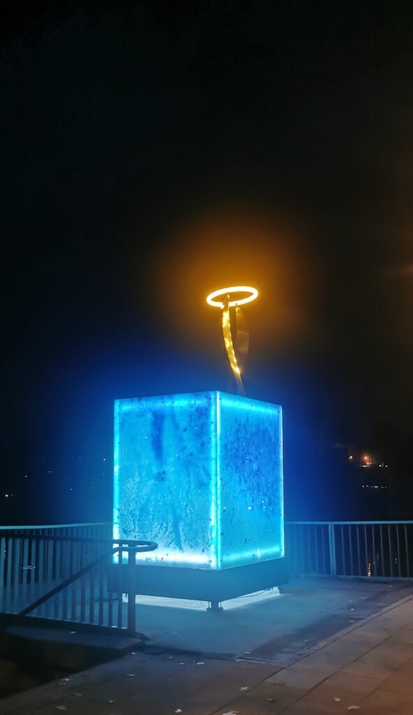 Die Skulptur setzt einen markanten Akzent am Wasser: Auf einem türkisfarbenen, von innen beleuchteten Kubus steigen zwei Edelstahlfische auf und halten gemeinsam einen leuchtenden Ring in die Höhe – eine Form, die prägnant, humorvoll und zugleich reich an Symbolik ist. Der Ring erinnert an Mythen und Märchen, an verschollene und wiederkehrende Glücksbringer, aber auch an das klassische Motiv der Verbundenheit. Gerade angesichts gesellschaftlicher Spannungen setzt die Skulptur ein bewusstes Zeichen für Miteinander und Zusammenhalt.